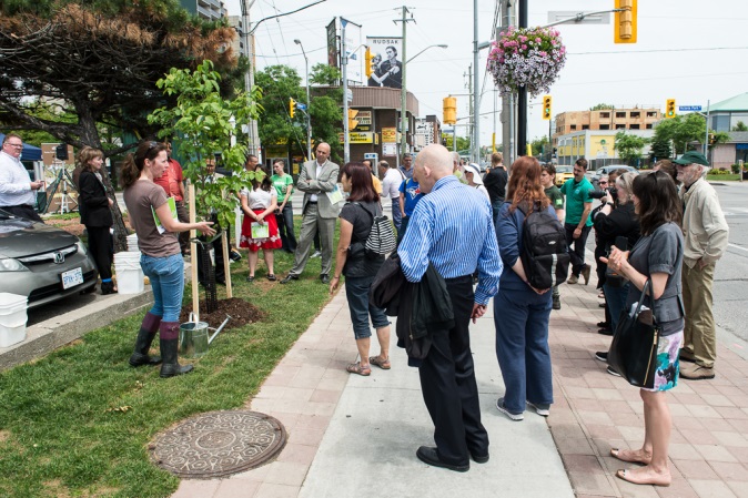 Catherine Dorton, a local resident and tree advocate, was one of the speakers to take the podium during the celebration. As a member of the Danforth East Community Association (DECA) and a graduate of LEAF’s Tree Tenders Volunteer Training Program , she eloquently sewed together the vision for a more vibrant, walkable, safe and fun community and the vital role street trees play in achieving that vision. She emphasized how helping the trees grow will beautify and shade the Danforth, providing relief from the hot sun and attracting more people to visit this commercial district.