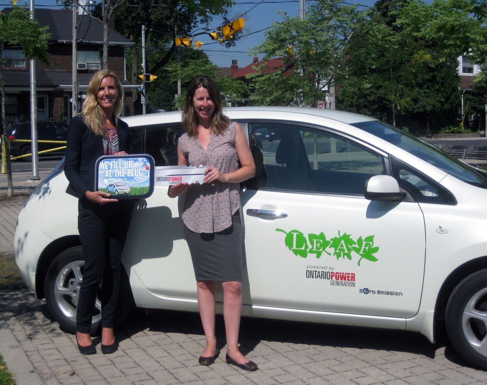 Kendra Flagler, Vice-President, Environment, OPG (left), presents Janet McKay, Executive Director, LEAF with the “key” to our new car.
