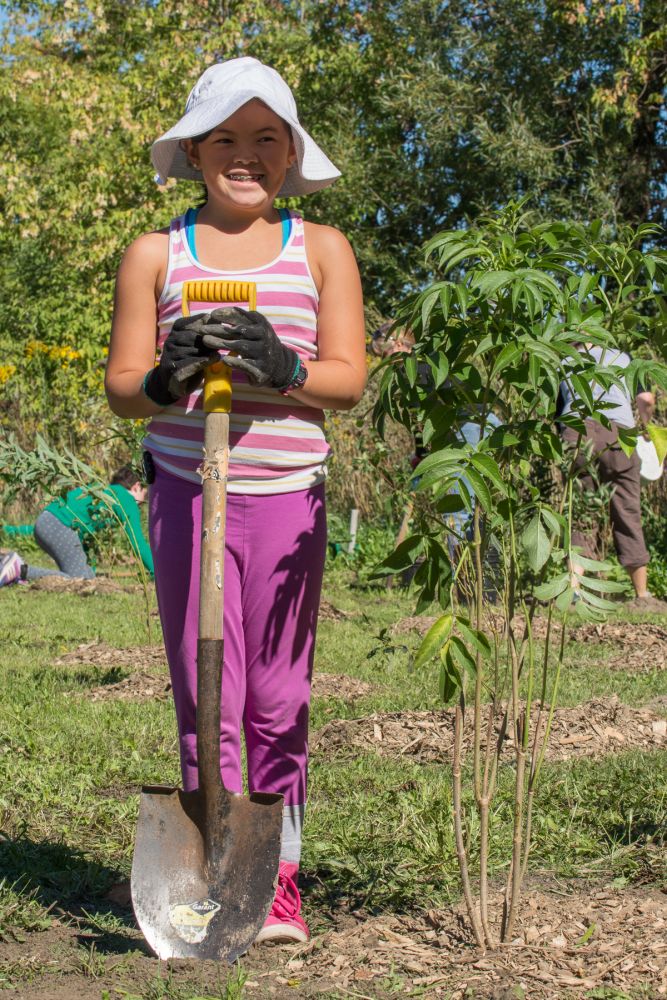 Barkley, LEAF’s tree mascot, poses with some young planters.