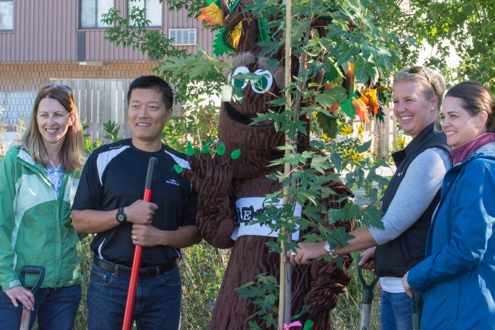 Janet McKay (LEAF Executive Director), Councillor Harold Kim (Town of Aurora), Barkley (LEAF’s mascot), Sara Tienkamp (Town of Aurora) and Barb Davies (York Region) planted a ceremonial Freeman maple tree in the park as part of the festivities.