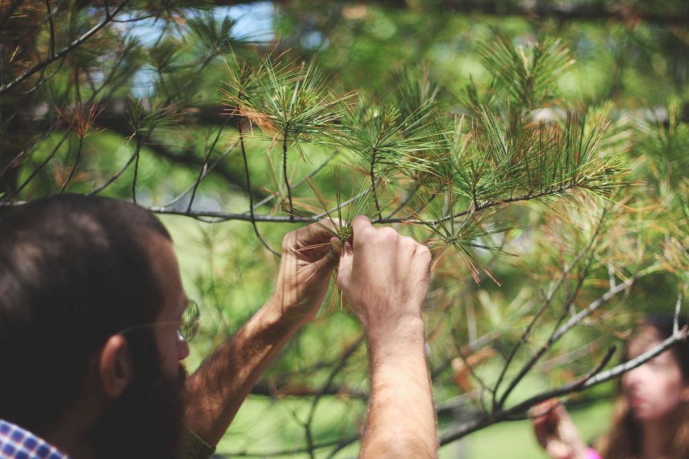 Mark Sherman, course instructor, shows students how to identify a pine tree