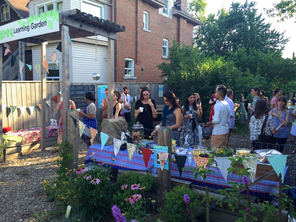 Garden Party guests gathered in the LEAF Learning Garden for a fun evening celebration